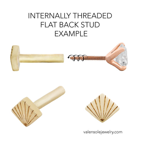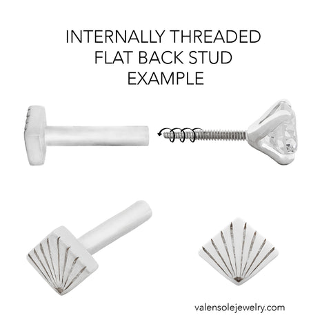 Each stud features a threaded screw front that seamlessly secures into our internally threaded flat back posts. Available in post lengths of 5mm, 6.5mm, or 8mm, and in 19 gauge (0.9mm) or 16 gauge (1.2mm) thickness, these studs offer versatile options to suit your unique needs. Our signature diamond-shaped logo backing makes tightening your jewelry easier and ensures a secure fit.
